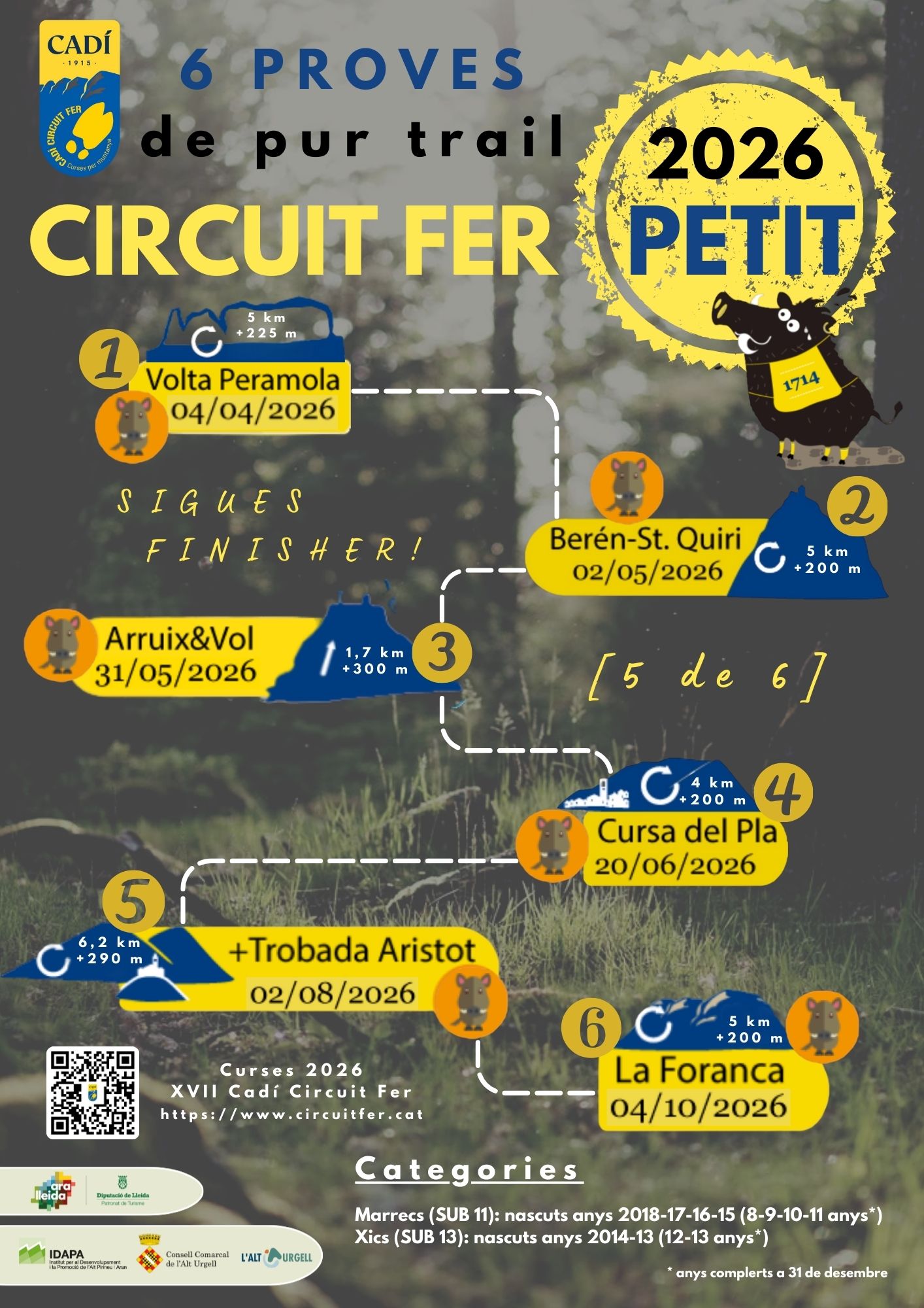 Curses 2026 Benvolguts/des Fers, Us presentem el calendari de curses del Circuit Fer 2026 Aneu escalfant que enguany són 11 curses més 2 curses amigues per endavant i ... comencem el 22 de març III Embarrancada Distància: 10 Km Desnivell: 500m Data: 22-03-2026 IX Volta Peramola Distància: 25 Km Desnivell: +1600m Data: 04-04-2026 I Mata-santsDistància: 20 KmDesnivell: +900mData: 25-04-2026 VI Berén-St.Quiri Distància: 19 Km Desnivell: +1200m Data: 02-05-2026 XVII Arruix Santa Fe Distància: 4,3 Km Desnivell: +670m Data: 31-05-2026 XIX Escanyabocs Distància: 21 Km Desnivell: +852m Data: 06-06-2026 IV Cursa del Pla Distància: 13 Km Desnivell: +800m Data: 20-06-2026 XIX Trobada Aristot Distància: 22 Km Desnivell: +1800m Data: 02-08-2026 IV Vertical Prat Distància: 5,5 Km Desnivell: +754m Data: 05-09-2026 XIII Travessa Transfronterera Distància: 20,6 Km Desnivell: +1495m Data: 20-09-2026 VIII La Foranca Distància: 20 Km Desnivell: +1100m Data: 04-10-2026 I Cambrils-OdènDistància: 11 KmDesnivell: +700mData: 10-10-2026 IX Marató Boumort Distància: 46 Km Desnivell: +2150m Data: 24-10-2025 Radikal Estana Any 2026: descansa Vertical Urgellet Any 2026: descansa