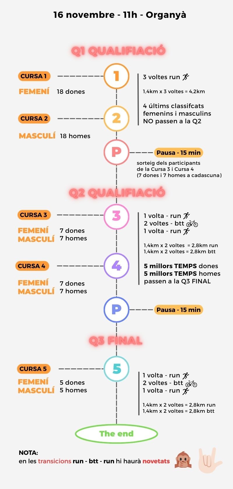 - Avituallament - l'organització només subministrarà un punt d'avituallament líquid amb aigua i begudes isotòniques. Aquest estarà ubicat a la zona de sortida/arribada